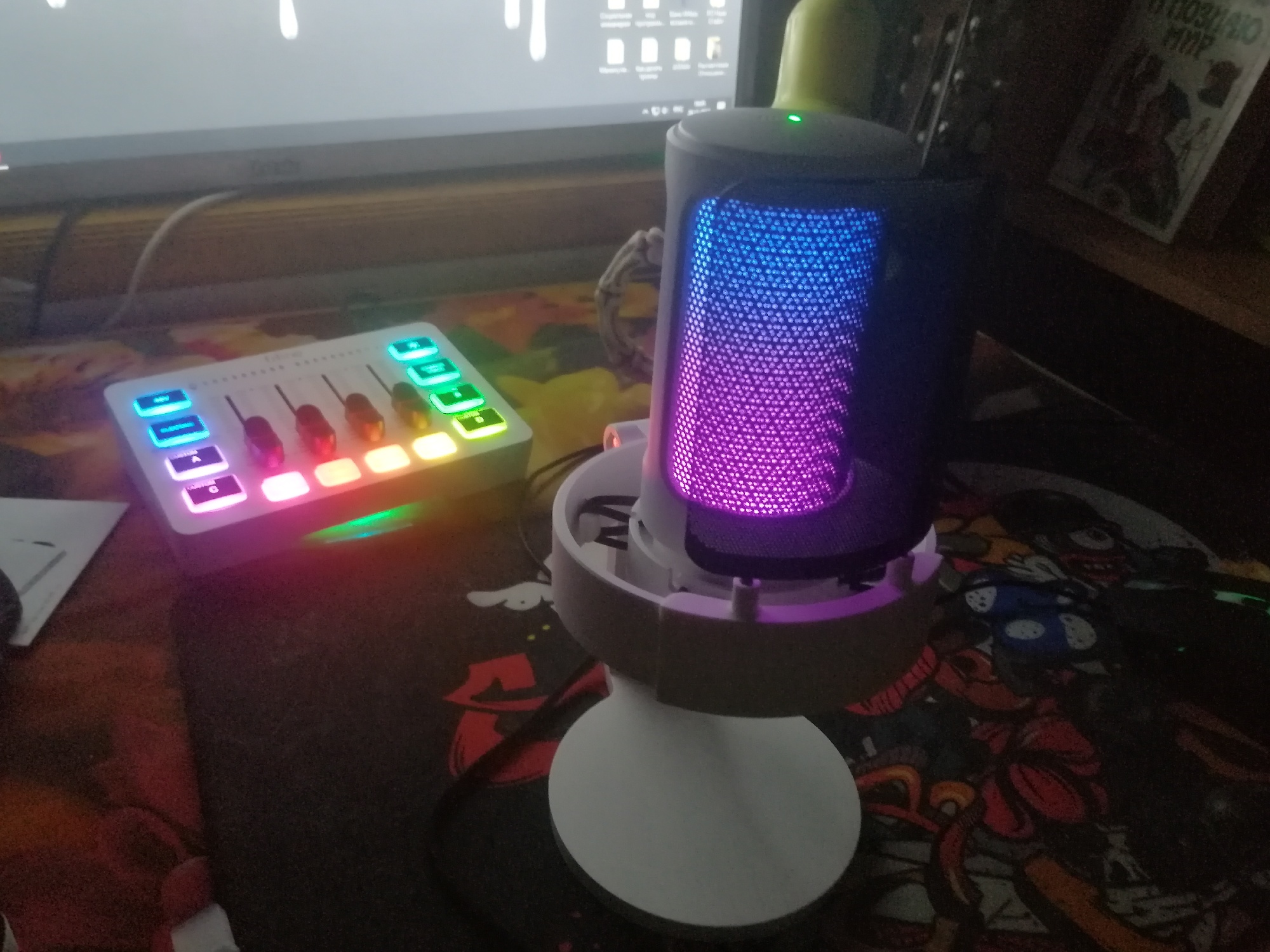The microphone is excellent, it didn't take much time to adjust, almost everything is set itself. With the box all a thrill, there are no dents, but I saw reviews where they seemed to sit on the box on purpose, that the microphone would definitely have suffered there, but at the same time it is whole. Okay, let's go. Records well, but nothing to compare, since my first. But I didn't understand the delivery of the joke. This is not critical, of course, but why write that he will come on November 19 (ordered 17), but in the end it was delayed for two days (21). I think that it is better to write that he will come, for example, 25, but in the end Bam and 21 arrived and it is pleasant to my soul)) I heard that the software seems to be on it until I checked it, as I check-I will add the review. Well, the microphone itself looks funny, though the Fifainov smiley face is barely visible when it is so bright in the pictures. Well, as you use it, if something is found-I will add it here. For now, it's all high.
