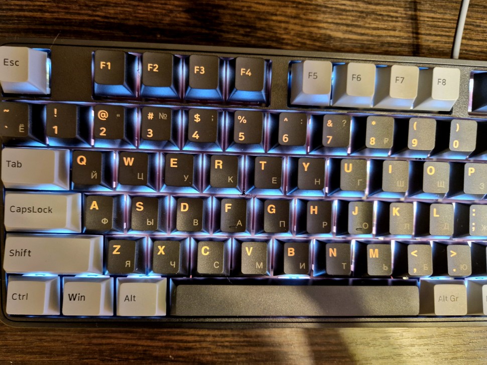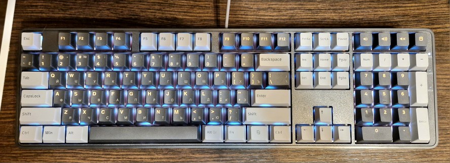 The keyboard is made with high quality, the keykaps are nice, quite heavy. But I realized that the main thing in the keyboard is switches. Here they are clearly cheap, the move is not the same at the beginning and at the end of pressing, the pressing force is unusually large after Red gatherons. But for 2000 p it's more of a nit. If you haven't used mechanics before, it's a great choice.